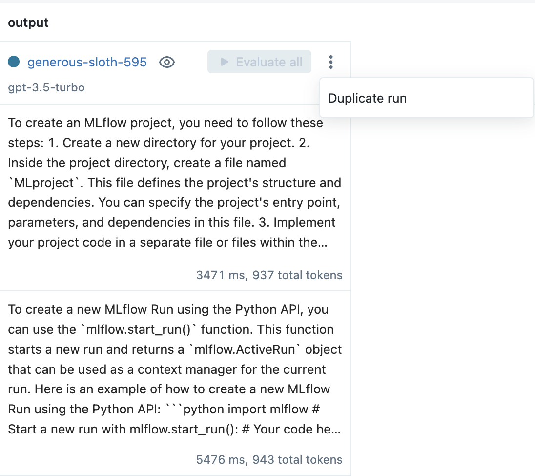 From the Evaluation tab, click the Evaluate all button next to the new Run to evaluate all of the previous inputs.