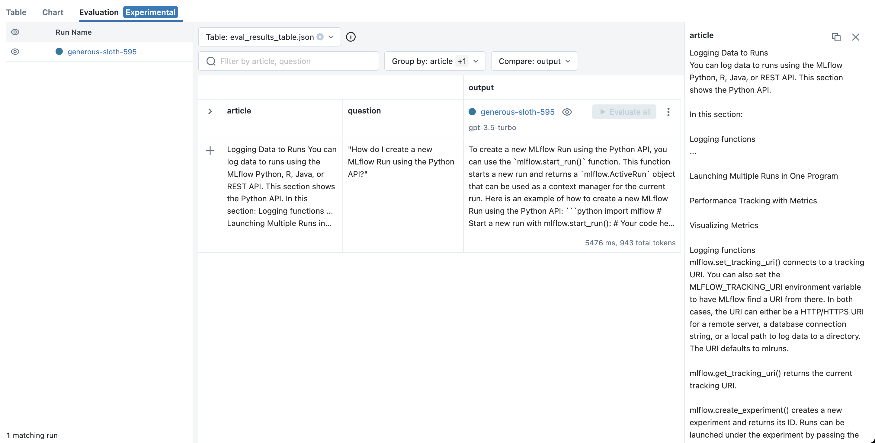 After your Run is created, MLflow will open the Evaluation tab where you can see your latest playground input & output and try out additional inputs: