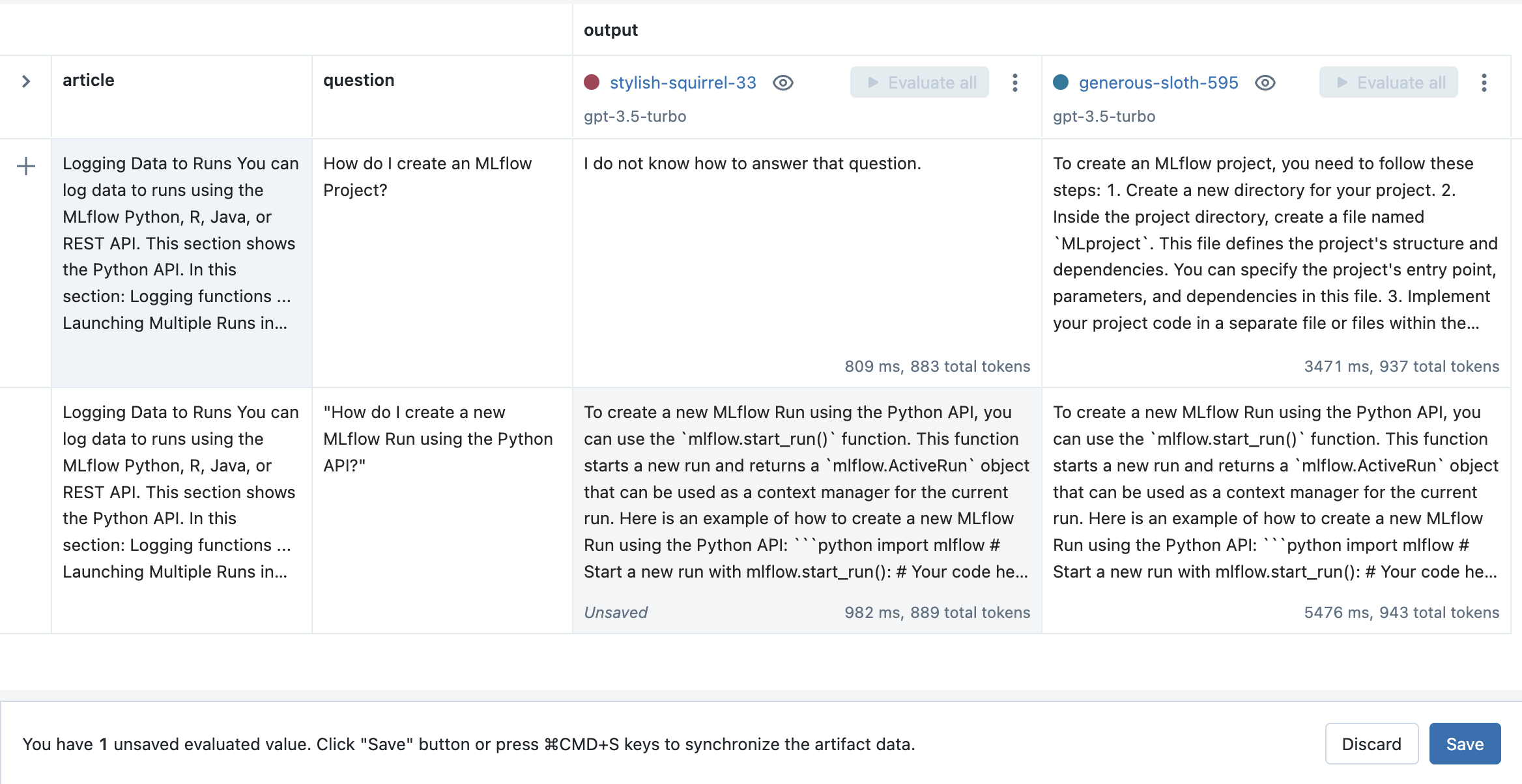 As you try additional inputs, you might discover scenarios where your choice of LLM, prompt template, and parameters doesn't perform as well as you would like. For example, in the MLflow documentation use case, the LLM still attempts to answer irrelevant questions about MLflow Projects even if the answer does not appear in the specified article.