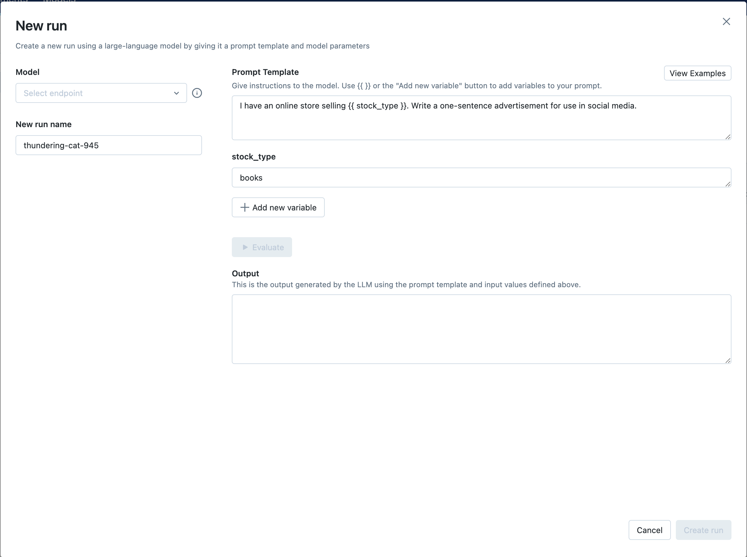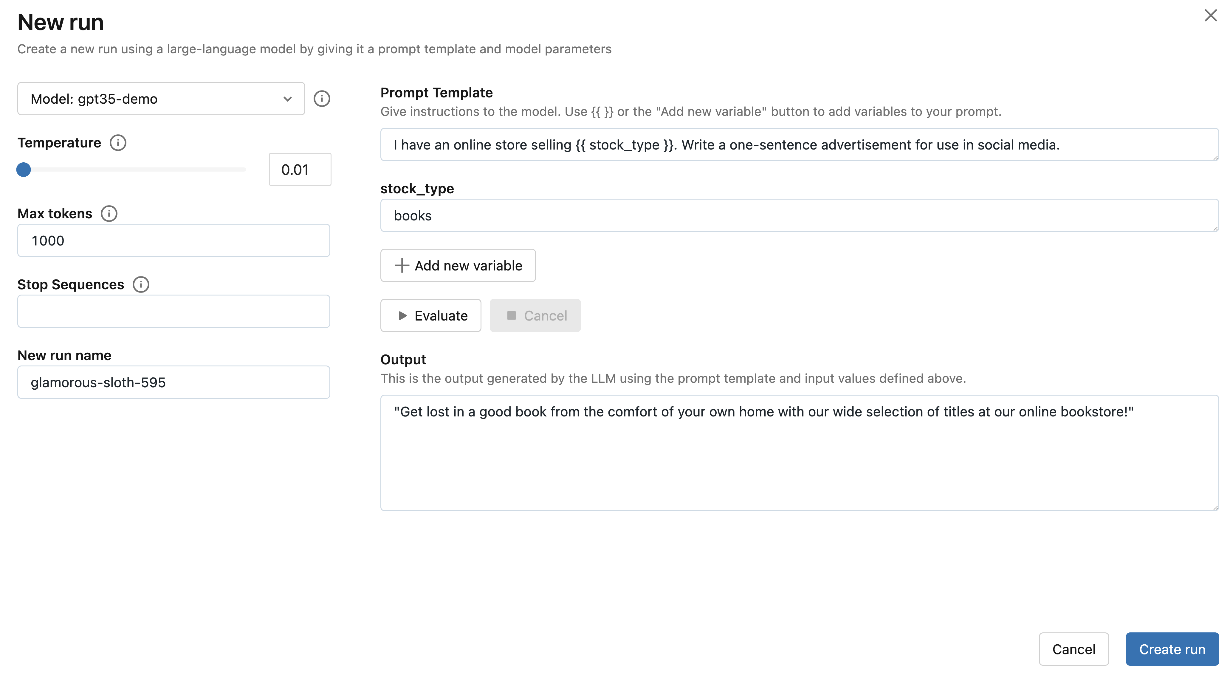 Once you're satisfied with your chosen prompt template and parameters, click the Create Run button to store this information, along with your choice of LLM, as an MLflow Run. This will create a new Run with the prompt template, parameters, and choice of LLM stored as Run params. It will also automatically create an MLflow Model with this information that can be used for batch or real-time inference.